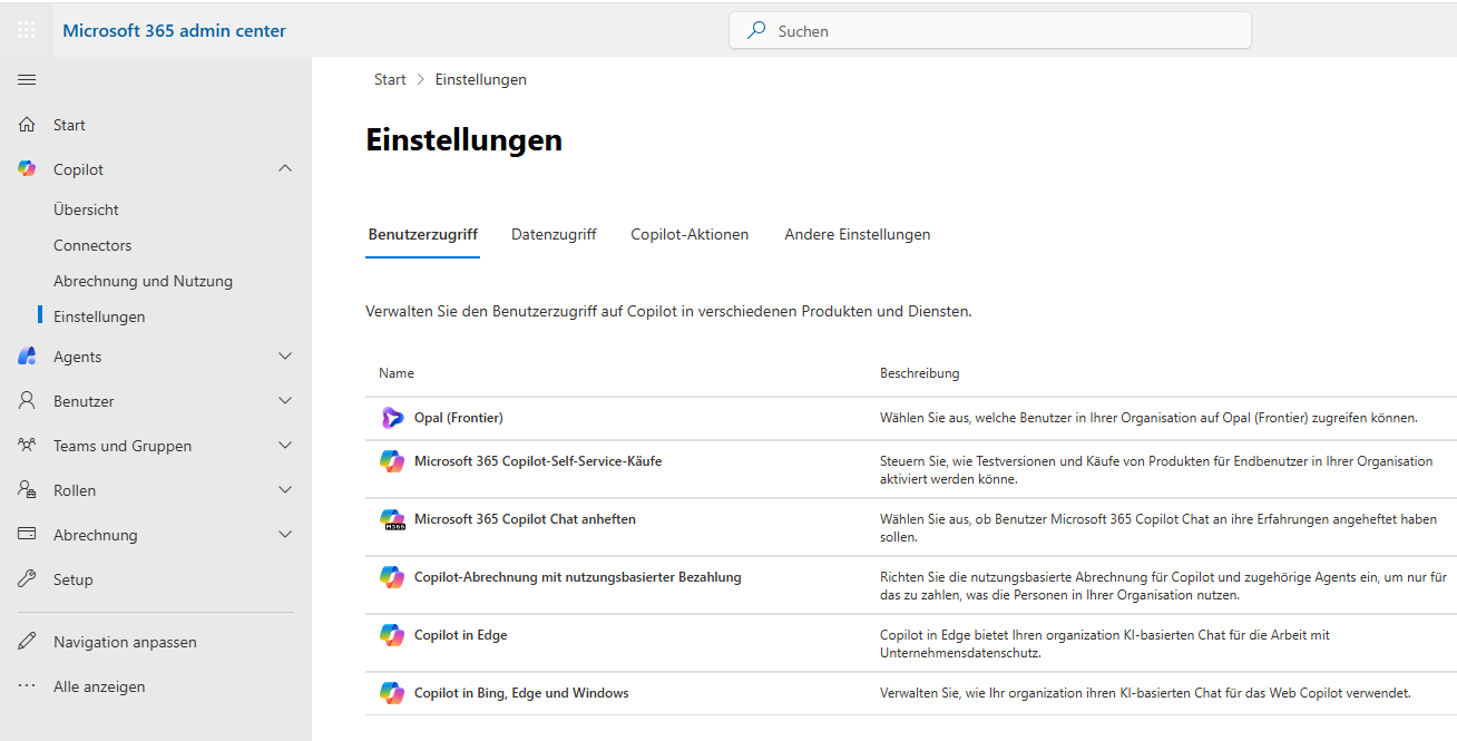 Unternehmen, die auf Microsoft-Cloud-Lösungen wie Microsoft 365 setzen, sollten sich mit den Copilot-Einstellungen im Microsoft 365 Admin Center auseinandersetzen. Diese sind unter dem Menüpunkt „Copilot“ auf https://admin.microsoft.com zu finden. Wichtig ist hier vor allem der Menüpunkt „Einstellungen“ und dort die Untermenüs „Benutzerzugriff“, „Datenzugriff“, „Copilot-Aktionen“ und „Andere Einstellungen“.